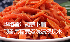 华炬新产品研究所技术咨询委员会科研人员现推荐一项姜汁胡萝卜脯制备用糖姜煮浸渍液技术,该技术以胡萝卜为载体,浸入白糖和姜汁,制成风味独特、口感好、营养丰富、让人们爱吃的休闭脯,制备工艺经过热烫处理和加入山梨酸钾,确保胡萝卜脯不变色,保质期达24个月以上,比现有技术延长一倍时间,而且工序简单,易于操作,现将该姜汁胡萝卜脯制备用糖姜煮浸渍液技术及实例介绍如下供研究参考:(211371  227371