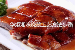 华炬新产品研究所技术咨询委员会科研人员现推荐一项湘味烧鹅工艺方法步骤,该技术湘味烧鹅,所用的湘味调料酱含有鲜葱、辣椒片、鲜姜、牛肉调味粉、食盐、桂皮粉、麦芽糊精等用于腌渍原料,可以使原料鲜嫩爽滑,香辣入味;湘味调料粉含有酱油粉、谷氨酸钠、食盐、肉蔻粉、小茴香粉、姜粉等,既含有鲜香成份,又含有香辣成份,在制作菜淆时添加,使得所制作的菜淆味道鲜美、且带有湖南菜的香辣风味;加之鹅肉本身营养丰富,因而,所加工的湘味烧鹅,其味道鲜美、营养丰富、且具有湖南特色,现将该湘味烧鹅工艺方法步骤及实施例介绍如下供研究参考:(311371 521306)