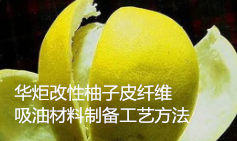 华炬新产品研究所技术咨询委员会科研人员现推荐一项改性柚子皮纤维吸油材料制备工艺方法,该技术与其他方法相比有益技术效果是:(1)采用具有大量沟槽,比表面积较大,具有松散网络结构的柚子皮为吸油主体,利用高温高压蒸汽通过扩散作用,渗透并浸润植物纤维的细胞壁,再突然降低压力,使纤维细胞内的冷凝水迅速蒸发膨胀,打破木质素包裹作用和纤维素结晶结构,显著增加材料的孔隙率,再用等离子体处理,激活纤维表面更多的活性位点,再进一步进行酯交换改性,纤维素上小分子量的羟基被大体积的乙酰基取代,削弱了分子间、分子内的氢键作用力,同时增大了空间位阻,一定程度的破坏了纤维素的结晶区结构,而且牢固包围结晶纤维素的半纤维素和木质素的凝聚态结构膨胀,从而导致酯交换改性后材料的孔隙率增大,增加纤维素本身的疏水亲油性,强化纤维素材料本身的空间结构,强化吸油性能;(2)制备的吸油材料吸附原油时,粒径对吸附除油基本无影响,2~5min就能达到吸附平衡,吸附速率快,低温条件有利于除油,且在各种酸碱条件下,中性吸油效果较好,吸油倍率波动较小,吸油量都相对较高,现将该改性柚子皮纤维吸油材料制备工艺方法及实施例介绍如下供研究参考:(241441 473327)