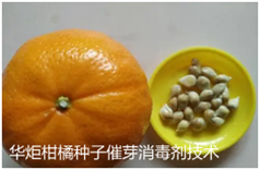 现有技术中,柑橘种子发芽催芽处理取得了一定效果,但不明显,一般种子发芽率在30%左右,最佳处理发芽率不足60%.,而且极不稳定,有些处理掌握不好,容易导致种子失去活力,特别是柑橘种子携带病虫害严重的现状,播种前需要对柑橘种子进行消毒的技术问题,华炬新产品研究所技术咨询委员会科研人员现推荐一项柑橘种子催芽消毒剂技术配方,该技术产品成本低,方法简单快捷,使种子能够保持良好的完整性与萌发活力,杀菌消毒效果好,与其他催芽剂兼容性好,成本低、适合大规模生产应用的特点,现将该柑橘种子催芽消毒剂技术配方及使用方法介绍如下供研究参考:(241441 421205)