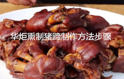 华炬新产品研究所技术咨询委员会科研人员现推荐一项熏制猪蹄制作方法步骤,该技术具有的有益效果:1、工艺简单,方便实用,原料来源广,生产成本低,产品容易保存、方便携带。2、加工过程中不添加任何化学防腐剂,且猪蹄本身具有丰富的营养价值,食用后有利于人们的身体健康。3、外观:表面枣红、油亮见光,皮肉不破损、骨头不外露,形体完好,表皮干韧,肉瘦香脆,色泽鲜亮,赏心悦目;食之则较现有的熏制猪蹄味道更纯正,熏香味浓,不粘嘴,油而不腻,入口脆烂,味道鲜美,口感更好,更适合人们的需求。4、所加入的卤料多为医食同源的佐料,常温下数日不变质、不变味,且具有一定的药理、保健功能,可健脾开胃、消食化滞、增加食欲,而且可以预防疾病,促进人体的生理健康,现将该熏制猪蹄制作方法步骤及实施例介绍如下供研究参考:(311211 324321)