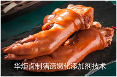 华炬新产品研究所技术咨询委员会科研人员现推荐一项华炬卤制猪蹄嫩化添加剂技术配方,该技术产品可使猪蹄肌肉纤维适度分散,促进肌红蛋白溶出,提高其嫩度和保水性,促使猪蹄和表皮紧实,肉质入味锁汁,入味均匀,同时增加猪蹄的光泽,使其在色、香、味、质达到理想的效果,使卤制猪蹄的嫩度达到最佳食用状态,且肉色较好,柔嫩多汁,所用原料无污染无毒害,符合食品添加剂使用标准,而且工艺简单,效果明显,具有广阔的工业应用前景和经济价值,现将该卤制猪蹄嫩化添加剂技术配方及实施例介绍如下供研究参考:(311211 324311)