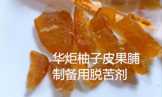 华炬新产品研究所技术咨询委员会科研人员现推荐一项柚子皮果脯制备用脱苦剂及方法,该技术方法创新的将化学溶剂脱苦法与麦芽糖醇糖煮进行结合,使得制备得到的柚子皮果脯无苦涩味且具有柚子皮的清香味;同时该柚子皮果脯的咀嚼性、弹性、胶着性、内聚性以及回复性等能符合果脯要求。此外,所述的柚子皮果脯使用麦芽糖醇作为甜味剂,不会使人体的血糖升高,能够供糖尿病人食用;与现有技术中以蔗糖作为甜味剂的柚子皮果脯相比,所述的柚子皮果脯可以称之为“无糖食品”,现将该柚子皮果脯制备用脱苦剂及方法及实施例介绍如下供研究参考:(241441 473306)