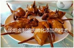 华炬科技新产品研究所技术咨询委员会科研人员现推荐一项卤制鸽肉嫩化添加剂及方法,该技术与现有技术相比具有如下有益效果:1.利用卤制鸽肉嫩化添加剂进行适度水解,辅以注液腌制方式对乳鸽进行处理,使肌肉纤维适度分散,促进肌红蛋白溶出,提高其嫩度和保水性。使鸽肉Z线断裂,肌原纤维出现小片化,嫩化肉质,一方面提高肉的持水力,另一方面其水溶液的弱碱性可以适当提高乳鸽的pH,提高蛋白酶的嫩化效率,降低酶用量。2、通过复卤回淋,促使鸽肉和表皮紧实,肉质入味锁汁,入味均匀,同时增加乳鸽的光泽,使其在色、香、味、质达到理想的效果。3、所用原料无污染无毒害,符合食品添加剂使用标准,而且工艺简单,效果明显,具有广阔的工业应用前景和经济价值,现将该卤制鸽肉嫩化添加剂及方法及实施例介绍如下供研究参考:(311381 323255)
