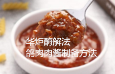 华炬科技新产品研究所技术咨询委员会科研人员现推荐一项酶解法鸽肉肉酱制备方法步骤,该技术有益效果:该技术创造性地将鸽肉与文蛤相结合,并采用复合酶解技术进行鸽肉嫩化,开发出口感兼具二者传统风味特色,又能满足现代人群对方便肉酱制品的需求,大大提高了产品附加值。本发明提出的具有海鲜风味的鸽肉肉酱,鲜香味美,弥补了市场上此种肉酱的空缺,实现了对鸽肉的深加工综合利用,延长了肉鸽加工产业链,而且加工工艺简单,便于大规模生产,是对肉鸽深加工的开发,有利于肉鸽养殖业的发展。经酶处理后的鸽肉酱口感鲜嫩,酶解后产生的氨基酸既利于人体消化又增加一定的营养功能,使用富含呈味氨基酸的文蛤作为配料既减少了鲜味剂的使用、增强了鲜度又补充了丰富的磷、钙、铁、维生素以及多种氨基酸等营养成分。大大提高了鸽肉的商品价值,促进肉鸽养殖与深加工,市场前景非常看好,现将该酶解法鸽肉肉酱制备方法步骤及实施例介绍如下供研究参考:(311381 321326)