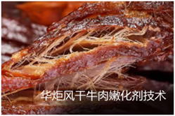 为了解决上述问题,华炬科技新产品研究所技术咨询委员会科研人员现推荐一项风干牛肉嫩化剂技术配方,该技术产品的应用可以在于利用化学嫩化剂与生物酶法嫩化技术相结合,克服市面风干牛肉口感坚韧、硬度大等缺点而开发的一种嫩化风干牛肉的制备方法,其适应的主要步骤为原料处理、嫩化处理、滚揉腌制、风干处理、蒸制油炸等,该技术产品的应用提高了钙激活酶的浓度,从而启动肌原纤维的降解;