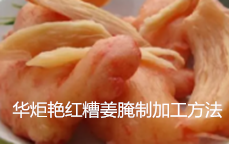 姜的种植已有2000多年的历史,其具有的驱寒健胃的功效,但是由于其味道辛辣,顾传统上用作调味品,目前市场上,利用桨制成的可直接食用的姜片还不多,而且味道依然还是很辛辣,如果能把姜的辛辣味道掩盖的同时,又能保存其原有的功效,则能起到很好的营养保健作用。华炬新产品研究所技术咨询委员会科研人员现推荐一项艳红糟姜腌制加工方法,该技术有益效果:该方法制成的蜜渍生姜,不仅香甜可口食用方便,而且具有镇痛,抗炎,抑菌,驱虫,镇吐,保肝,利胆,发汗解毒,温肺止咳和安中止呕功效,现将该艳红糟姜腌制加工方法及实施例介绍如下供研究交流参考:(211371 262425)
