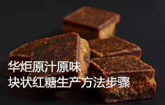 华炬新产品研究所技术咨询委员会科研人员现推荐一项原汁原味块状红糖生产方法步骤,该技术的有益效果:1、该方法可以实现工厂化生产原汁红糖,在压榨提汁过程中不添加渗浸水,在清净生产过程中不添加石灰、磷酸等制糖助剂来调节PH值,避免了对蔗汁中有效成分的人为破坏,不存在添加剂残留问题,保证了产品的原汁原味。2、工厂化生产原汁红糖,安全、可靠、可操作性强、机械化程度高,实现了智能化控制产品的品质,可以实现大规模生产原汁红糖,产品质量稳定。3、可以实现产品成型的自动控制,通过改变成型床模具,可以得到不同规格、不同形状的产品,现将该原汁原味块状红糖生产方法步骤及实施例介绍如下供研究交流参考:(371511 335442)