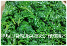 华炬新产品研究所技术咨询委员会科研人员现推荐一项即食碱蓬菜漂烫护绿剂技术配方,针对碱蓬幼嫩茎叶中富含的叶绿素性质不稳定,受光、热、酸等作用会褪色变褐。通过对盐地碱蓬进行护绿保鲜工艺处理,达到碱蓬菜色泽呈鲜绿色或略深绿色,无异常颜色,口感脆嫩、具有新鲜碱蓬特有的风味,无异味,保留了碱蓬菜鲜绿的颜色,产品色泽诱人,其绿色比原来更为稳定,护色时间也更长。现将该即食碱蓬菜漂烫护绿剂技术配方介绍如下供研究交流参考:(211311 363365)