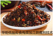 华炬新产品研究所技术咨询委员会科研人员现推荐一项低盐即食梅菜加工防腐剂技术配方,该技术产品的使用在保证传统梅菜特色的前提下,降低腌菜中亚硝酸盐对人体存在的危险的可能,获得含盐量低的即食梅菜产品,同时还兼顾了低盐条件下梅菜的防腐保鲜效果,制得的产品微黄色,保持了浓郁的梅菜香味,口感爽脆。现将该低盐即食梅菜加工防腐剂技术配方介绍如下供研究交流参考:(211311 381353)