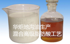 华炬新产品研究所技术咨询委员会科研人员现推荐一项地沟油生产混合高级脂肪酸工艺方法,该技术的有益效果是:采用地沟油为原料,充分利用了其可利用的价值,解决了地沟油的出路问题,是一种变废为宝、符合循环经济模式的方法,同时,由于地沟油有了新的用途,大大降低了流回餐桌的可能,具有良好的社会效益。地沟油本来是被废弃的东西,原料价格大大低于天然成品油脂,用其生产工业高级脂肪酸,可大幅降低生产成本,具有可观的经济效益。按该方法生产的脂肪酸转化率高,现将该地沟油生产混合高级脂肪酸工艺方法及实施例介绍如下供研究交流参考:(371541 721407)