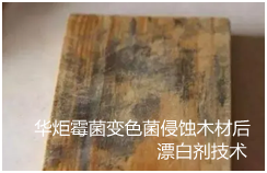 木材受到变色菌和霉菌的侵蚀后,原有的颜色发生了变化,这种颜色变化称为变色,变色菌或霉菌侵入木材后,摄取木材细胞腔内的养料,但不分解细胞壁的物质,在其全部活动过程中只能引起变色,常见的有边材变成青灰色,叫青变,也有由变色菌引起木材呈红棕色斑点,叫红斑,还有杂色相隔的叫杂斑等。针对霉菌、变色菌侵蚀木材后产生霉变华炬新产品研究所技术咨询委员会科研人员现推荐一项霉菌变色菌侵蚀木材后漂白剂技术配方,利用该技术产品对于木材的漂白来讲效果理想,操作较简单,也不费工费时,漂白的能力好,适宜浅色木材和部分漂白,现将该霉菌变色菌侵蚀木材后漂白剂技术配方及操作方法介绍如下供研究交流参考:(571411 561456)