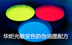 华炬新产品研究所技术咨询委员会科研人员现推荐一项光敏变色防伪油墨配方,该技术的有益效果是:该技术产品光敏变色防伪油墨,采用丙烯酸乳液、醇酸树脂作为连结料,采用光致变结晶颜料,并乙醇和水作为溶剂,加入蜡粉、填料和助剂,得到可逆的、变色敏感的光致变防伪油墨。该技术制备简便,能够适用于各种敏感变色防伪的物品,现将该光敏变色防伪油墨配方及实施例介绍如下供研究交流参考:(741411 531431)