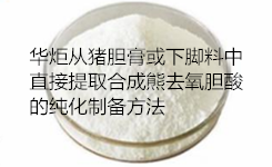 华炬新产品研究所技术咨询委员会科研人员现推荐一项从猪胆膏或下脚料中直接提取合成熊去氧胆酸的纯化制备方法,该技术的优点 该技术用低含量的猪胆酸或下脚料直接提取合成了熊去氧胆酸粗品,并制备熊去氧胆酸的专有复合物,而进一步去除其它杂质。水解得到药用级熊去氧胆酸。省却鹅去氧胆酸的进一步精制,简化了工艺,降低了成本,去除了影响产品质量的其杂质,特别是重金属离子和溴酸根离子。达到美国药典33版和英国药典2010版标准,现将该从猪胆膏或下脚料中直接提取合成熊去氧胆酸的纯化制备方法及实施例介绍如下供研究交流参考:(311211 364494)