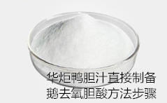 华炬新产品研究所技术咨询委员会科研人员现推荐一项用鸭胆汁直接制备鹅去氧胆酸方法步骤,该技术与现有技术相比具有以下的有益效果:该方法直接用鸭胆汁皂化、酸化、除脂后,经甲酯化、乙酰化并加氢还原反应,再皂化、干燥、结晶得到鹅去氧胆酸。该技术工艺制备方法步骤简单、成本低廉,易于控制,适于产业化应用。利用该技术的制备方法制备得到的鹅去氧胆酸得率高、纯度高,可达95%以上,现将该用鸭胆汁直接制备鹅去氧胆酸方法步骤及实施例介绍如下供研究交流参考:(311371 335441)