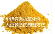 华炬新产品研究所技术咨询委员会科研人员现推荐一项一种具有抗氧化性大豆多肽的制备方法步骤,该技术的有益效果:该技术所制备的具有抗氧化性的大豆多肽是一种黄褐色的粉末状固体,主要成分为分子量不大于1000的小分子多肽和少量多糖,该混合肽的水溶性较好,制备方法简便,易于推广,并且没有酶水解蛋白产生的苦味,可以应用于食品中,在食品领域具有广泛的应用前景,现将该一种具有抗氧化性大豆多肽的制备方法步骤及实施例介绍如下供研究交流参考:(211211 315455)