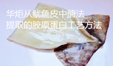 华炬新产品研究所技术咨询委员会科研人员现推荐一项一种从鱿鱼皮中酶法提取的胶原蛋白工艺方法,该技术与现有技术相比的优点在于:1)该技术胶原蛋白颜色较白、无鱼腥味、产品纯度高,松散且多孔,有规则均匀的蜂窝状多孔,这种网状多孔结构适合于做药物载体,不仅有利于药物的均匀分布,还有利于液体的挥发;2)该胶原蛋白制备方法简单,易于工业化生产,安全性更高,胶原蛋白的提取率高,大大提高了鱿鱼皮的附加值,市场发展潜力大;3)该技术脱色使用的活性炭具有良好的脱色性能与吸附性能,能够降低活性炭的用量,缩短脱色时长,同时能除去鱼腥味,且该活性炭能循环利用,对鱿鱼皮胶原蛋白无不良影响,无环境污染,不腐蚀设备,经济适用,具有良好的前景,从环保的观点来看,改性活性炭是一种环境友好型的材料,现将该一种从鱿鱼皮中酶法提取的胶原蛋白工艺方法及实施例介绍如下供研究交流参考:(341211 525327)