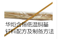 华炬新产品研究所技术咨询委员会科研人员现推荐一项一种含锡低温铜基钎料配方及制备方法,该技术与现有技术相比具有以下优点:1、不含贵金属白银,降低了生产成本,节约了资源;2、与铜合金或邦迪管工件钎焊后接头机械强度高,致密性好,泄漏率低,表面光洁;3、钎料溶化温度为600-700℃,明显低于银钎料和常用的铜磷银钎料,钎焊时可降低钎焊温度,防止母材过热或过烧,进而避免因此而产生的母材氧化或性能失效,并且塑性较好,可加工成各种规格、型号的焊环、焊条、焊丝或薄带,现将该一种含锡低温铜基钎料配方及制备方法及实施例介绍如下供研究交流参考:(611341 431552)