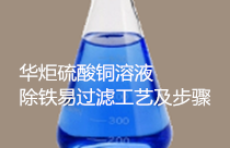 华炬新产品研究所技术咨询委员会科研人员现推荐一项一种硫酸铜溶液除铁易过滤工艺及步骤,该技术的有益效果是:1)该技术在过滤氢氧化铁之前加入助滤剂,能够实现快速过滤。2)该技术过滤除铁过程中不需要沉降过程,缩减了反应时间。3)该技术通过喷雾干燥得到的硫酸铜固体粉末颗粒细小、粒径均匀、产品 纯度高,现将该一种硫酸铜溶液除铁易过滤工艺及步骤及实施例介绍如下供研究交流参考:(611341 445539)