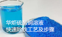 华炬新产品研究所技术咨询委员会科研人员现推荐一项一种硫酸铜溶液快速除铁工艺及步骤,该技术的有益效果是:1)该技术在硫酸铜溶液中加入的氢氧化镁微粉部分溶解,与铁离子形成氢 氧化铁,不溶的氢氧化镁微粉吸附氢氧化铁胶体,从而能将氢氧化铁快速过滤 除去。2)该技术通过离子交换树脂除去硫酸铜溶液中的镁离子,避免引入杂质镁 离子。3)该技术硫酸铜溶液快速除铁工艺成本低廉、过程简单、除铁效果好,现将该一种硫酸铜溶液快速除铁工艺及步骤及实施例介绍如下供研究交流参考:(611341 445447)