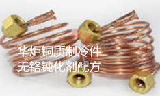 华炬新产品研究所技术咨询委员会科研人员现推荐一项一种铜质制冷件无铬钝化剂配方,该技术的有益技术效果从小型铜质制冷件无铬钝化和传统铬酸钝化工艺相比得到充分体现,采用该技术无铬钝化剂的工艺流程只有四道工序,即无铬钝化、水洗、吹干或烘干和成品四道工序,取消了原八道工序中的两道水洗工序、铬酸钝化工序和酸洗处理工序,简化了工艺过程,提高了生产效率,彻底避免了硝酸或混合酸酸洗处理工件时产生大量有毒的酸雾和铬酸盐对操作人员的危害以及对环境的污染,现将该一种铜质制冷件无铬钝化剂配方及实施例介绍如下供研究交流参考:(611341 473502)