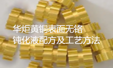 华炬新产品研究所技术咨询委员会科研人员现推荐一项一种黄铜表面无铬钝化液配方及工艺方法,该技术的有益效果为:1)该技术的钝化液中不含有铬,选用1-苯基-5巯基四氮唑和苯并三氮唑复配 使用,作为主要缓蚀剂成份;对环境友好,2)选用双氧水、硼酸等与植酸复配使用,使黄铜表面更快形成具有一定厚度的 膜层,膜层更加致密,耐腐蚀性能持久,且抗变色时间长久,现将该一种黄铜表面无铬钝化液配方及工艺方法及实施例介绍如下供研究交流参考:(611341 473612)