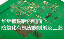 华炬新产品研究所技术咨询委员会科研人员现推荐一项一种镀铜后的铜面防氧化有机皮膜制剂及工艺,该技术的有益效果是:能产生一种由苯骈三氮唑为主体有机膜,能有效防止PCB板的铜面氧化,而醋酸锌是稳定该有机皮膜的稳定剂,让其抗氧化时间得到更多的延长,所述皮膜抗水性强,但是不耐酸碱性,可以再酸碱液里面很容易的清洗出去,降低了对环境和对人体的危害,现将该一种镀铜后的铜面防氧化有机皮膜制剂及工艺及实施例介绍如下供研究交流参考:(611341 453424)