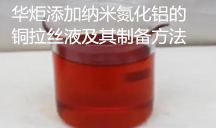 华炬新产品研究所技术咨询委员会科研人员现推荐一项一种添加纳米氮化铝的铜拉丝液及其制备方法,该技术的优异效果是:该技术通过研磨将纳米氮化铝、硼酸铝等磨料与表面活性剂混合,不仅具有良好的抗磨性,而且能够快速散热,结合助剂,具有良好的抗磨、分散、润滑、成膜性,能够在铜丝表面形成一层保护膜,防止外界对铜丝的腐蚀;本发明铜线专用拉丝油流动粘度低、流动性好 , 并具有良好润滑效果且安全性强,现将该一种添加纳米氮化铝的铜拉丝液及其制备方法及实施例介绍如下供研究交流参考:(611341 543441)