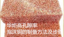华炬新产品研究所技术咨询委员会科研人员现推荐一项一种高孔隙率泡沫铜的制备方法及步骤,该技术的技术效果在于:该技术工艺简单、孔率可控、成本低廉,对设备要求不高,且通过本方法制成的高孔隙率泡沫铜性能优良,适合工业上使用,易于大范围推广,现将该一种高孔隙率泡沫铜的制备方法及步骤及实施例介绍如下供研究交流参考:(611341 553483)