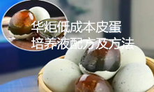 华炬新产品研究所技术咨询委员会科研人员现推荐一项一种低成本皮蛋培养液配方及方法,该技术培养液生产皮蛋只需将鸭蛋、鸡蛋等放入浸泡150小时故成本低,时间短。又由于本培养液配方中的硫酸锌,在皮蛋变性期间,可去掉原蛋中的铅部分,故成品中也不含铅,现将该一种低成本皮蛋培养液配方及方法及实施例介绍如下供研究交流参考:(311341 323706)