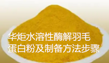 华炬新产品研究所技术咨询委员会科研人员现推荐一项一种水溶性酶解羽毛蛋白粉及制备方法步骤,该技术的有益效果:该技术的水溶性酶解羽毛蛋白粉的制备方法,在蒸煮处理过程中,使用氮气对羽毛中的氨基酸进行保护,避免氨基酸在蒸煮过程中因高温氧化失去生物效价,可提高氨基酸的利用率。选用复合酶分阶段对羽毛进行酶解,酶解产物中的蛋白含量和小肽含量较高。使用喷雾干燥进行瞬间干燥,可保护半胖氨酸,提高羽毛蛋白的功能性。此外,该技术的水溶性酶解羽毛蛋白粉的制备方法,工艺参数容易控制,生产成本低,实现废弃资源再利用,经济效益可观。该技术的水溶性酶解羽毛蛋白粉蛋白质含量和小肽含量(占总蛋白质比例)较高,体外消化率为93.5%-98.3%,易于消化吸收,产品质量稳定,可以作为饲料或优质蛋白原料使用,现将该一种水溶性酶解羽毛蛋白粉及制备方法步骤及实施例介绍如下供研究交流参考:(311311 381394)