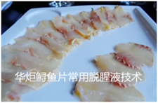 为快速有效的去除鲟鱼腥味,华炬新产品研究所技术咨询委员会科研人员现推荐一项一种鲟鱼片常用脱腥液配方及方法,采用该技术产品的使用可以较为快速达到去腥效果,并具有保水作用,使鱼肉吸水,变得富有光泽、弹性,在一定程度上具有抗冻效果,延长鱼肉保鲜期,提高鱼肉感官效果,现将该一种鲟鱼片常用脱腥液配方及方法介绍如下供研究交流参考:(341211 171441)