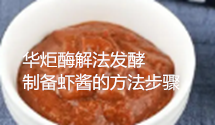 华炬新产品研究所技术咨询委员会科研人员现推荐一项一种酶解法发酵制备虾酱的方法步骤,该技术的有益效果为:在葡萄糖溶液中加入活化剂,活化剂能加快乳酸菌活化速度,从而得到活力旺盛且数量足够的菌种;酶解过程中加入酶解剂和添加剂,酶解剂能将虾粉中的蛋白质快速水解,缩短虾酱制备时间;添加剂能使制备的虾酱呈紫红色,有光泽,香气浓郁,鲜虾味浓郁,味道鲜美,有甜味,无腥臭味,高蛋白低脂,含丰富虾青素和柠檬酸钙。相比无机钙,柠檬酸钙更易被人体吸收;发酵过程中加入消除剂,所述的消除剂具有很强的还原性,可有效清除发酵过程产生的亚硝酸盐;陶罐封口膜上有涂层,能抑制细菌的滋生。是一种发酵制备虾酱的方法,所述的方法制备的虾酱中亚硝酸盐含量低,鲜虾味浓郁,口感好,现将该一种酶解法发酵制备虾酱的方法步骤及实施例介绍如下供研究交流参考:(341311 441388)
