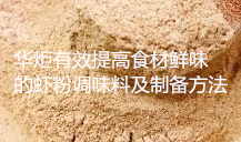 华炬新产品研究所技术咨询委员会科研人员现推荐一项一种有效提高食材鲜味的虾粉调味料及制备方法,该技术与现有技术相比具有如下有优点:该技术产品是一种由虾磨成粉的调味料,用于家庭煮汤调味,虾的营养价值非常高并且虾的味道非常甜,煮汤时放一点虾粉,汤味清甜可口,能够起到调味又营养的作用,其优点在于能够有效提高食材的鲜味,天然无毒副作用,现将该一种有效提高食材鲜味的虾粉调味料及制备方法及实施例介绍如下供研究交流参考:(341311 451318)