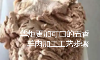 华炬新产品研究所技术咨询委员会科研人员现推荐一项一种更加可口的五香羊肉加工工艺步骤,该技术该技术先将羊肉浸泡除血水后腌制,保证了羊肉的清洁和盐分;羊肉进行冷冻,将其嫩化,增加了口感;再将羊肉在茶水中蒸煮,可以有效的去处羊肉中的膻味;同时在蒸煮羊肉的锅中加入八角、甘草、丁香、碧波、白芷、陈皮、桂皮、茴香、草果、生姜、罗布麻叶、川芎、花椒、山楂核粉,增加羊肉的味道和口感,之后会在羊肉汤总加入大葱进行调味,加酱油进行着色和调味;再在羊肉表面图上富有维生素的薏仁油,让羊肉更加可口。本发明提出的五香羊肉不仅口感好,而且营养丰富,现将该一种更加可口的五香羊肉加工工艺步骤及实施例介绍如下供研究交流参考:(311271 323544)