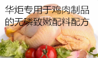 华炬新产品研究所技术咨询委员会科研人员现推荐一项一种专用于鸡肉制品的无磷致嫩配料配方,该技术即使在高温及干燥失水等恶劣条件下也能在鸡肉细胞表面形成保护膜。所以,保护鸡肉制品中的蛋白质分子效果良好,尤其是在碳酸钾和碳酸钠的作用下,可对肉类产生很好的嫩化作用。该技术产品既解决了磷酸盐危害人们健康的问题,又达到了磷酸盐产生的嫩肉效果,现将该一种专用于鸡肉制品的无磷致嫩配料配方及实施例介绍如下供研究交流参考:(311311 321334)