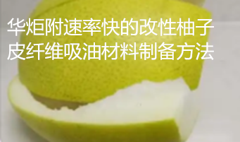 华炬新产品研究所技术咨询委员会科研人员现推荐一项一种附速率快的改性柚子皮纤维吸油材料制备方法,该技术与其他方法相比,有益技术效果是:(1)该技术采用具有大量沟槽,比表面积较大,具有松散网络结构的柚子皮为吸油主体,利用高温高压蒸汽通过扩散作用,渗透并浸润植物纤维的细胞壁,再突然降低压力,使纤维细胞内的冷凝水迅速蒸发膨胀,打破木质素包裹作用和纤维素结晶结构,显著增加材料的孔隙率,再用等离子体处理,激活纤维表面更多的活性位点,再进一步进行酯交换改性,纤维素上小分子量的羟基被大体积的乙酰基取代,削弱了分子间、分子内的氢键作用力,同时增大了空间位阻,一定程度的破坏了纤维素的结晶区结构,而且牢固包围结晶纤维素的半纤维素和木质素的凝聚态结构膨胀,从而导致酯交换改性后材料的孔隙率增大,增加纤维素本身的疏水亲油性,强化纤维素材料本身的空间结构,强化吸油性能;(2)该技术制备的吸油材料吸附原油时,粒径对吸附除油基本无影响,2~5min就能达到吸附平衡,吸附速率快,低温条件有利于除油,且在各种酸碱条件下,中性吸油效果较好,吸油倍率波动较小,吸油量都相对较高,现将该一种附速率快的改性柚子皮纤维吸油材料制备方法及实施例介绍如下供研究交流参考:(241441 473571)