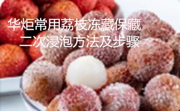 华炬新产品研究所技术咨询委员会科研人员现推荐一项一种常用荔枝冻藏保藏二次浸泡方法及步骤,该技术的有益效果:由于在采用该技术方法,延长了冷藏及保鲜的时间,与传统的冷藏方法相比,有极好的保鲜效果,冻藏一年后,解冻后的荔枝品质与鲜果几乎无变化,汁液流失率小,荔枝表皮色泽没有发生明显变化,现将该一种常用荔枝冻藏保藏二次浸泡方法及步骤及实施例介绍如下供研究交流参考:(241441 241473)