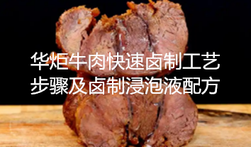 为了满足现在人们对快捷消费酱卤肉制品方便性的要求,使产品向工业化、集约化方向发展,就需要解决产品的保藏问题,真正做到卤制品实现工业化生产的目的。华炬新产品研究所技术咨询委员会科研人员现推荐一项一种牛肉快速卤制工艺步骤及卤制浸泡液配方,该技术提供了一种标准化、有效提升产品保藏时间的快速卤制牛肉的工艺,在不添加任何食品添加剂的同时,有效延长卤牛肉的保藏时间。有益效果在于:1、采用超声浸泡联合磁场处理的预煮的牛肉,能将该技术复配得到的浸泡液有效的包覆在牛肉内部,其中柑橘纤维的使用,能提高抑菌液的稳定性,让浸泡液在牛肉内部形成优秀的聚结稳定性和控制释放能力,具有长期的抑菌效果,弥补了卤制品在后期销售过程中短效保鲜的不足。同时,上述抑菌液联合超声浸泡及磁场处理有效缩短了牛肉的卤制时间,在同等卤制时间内,本发明制得的牛肉质构更佳。经试验验证,相同质构的牛肉,该技术所需卤制时间相比传统卤制时间缩短40%~50%。2、后续真空包装时采用经高压蒸汽处理后瞬时降压处理的香辛料提取制得的提取液,通过改善包装内部的环境,在保持食品原有品质的同时,提高食品安全性,延长食品货架期的。通过香辛料中抑菌成分的缓慢释放,产生长久的抗菌活性,在包装内部维持长期稳定的抗菌剂浓度从而达到食品防腐保鲜的目的,具有传统包装材料不可比拟的优点。可广泛应用于生鲜食品的包装,安全有效地延长食品货架期。同时,香辛料也为卤制后的牛肉提供了更饱满的风味,现将该一种牛肉快速卤制工艺步骤及卤制浸泡液配方及实施例介绍如下供研究交流参考:(311241 324494)