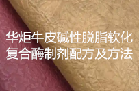 华炬新产品研究所技术咨询委员会科研人员现推荐一项一种牛皮碱性脱脂软化复合酶制剂配方及方法,该技术产品复合酶制剂能够在均匀、温和地松散皮内纤维的同时有效脱除皮内外多余油脂,且产生的废水生物可降解,安全环保,现将该一种牛皮碱性脱脂软化复合酶制剂配方及方法及实施例介绍如下供研究交流参考:(311241 331299)
