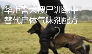 华炬新产品研究所技术咨询委员会科研人员现推荐一项一种用于警犬搜尸训练中替代尸体气味剂配方,该技术的有益效果:此种配方与人体尸体配方类似,能有效的训练搜尸犬,且配方中的几种化学物在常温下为固态和液态,便于携带和使用,现将该一种用于警犬搜尸训练中替代尸体气味剂配方及实施例介绍如下供研究交流参考:(311611 271478)