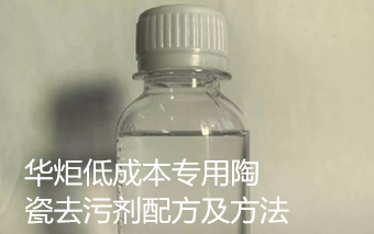 华炬新产品研究所技术咨询委员会科研人员现推荐一项一种低成本专用陶瓷去污剂配方及方法,该技术的有益效果是:专门针对陶瓷,且对陶瓷釉质无损,去污效果好,无污染,无毒副作用,且成本低廉,现将该一种低成本专用陶瓷去污剂配方及方法及实施例介绍如下供研究交流参考:(871311 671576)