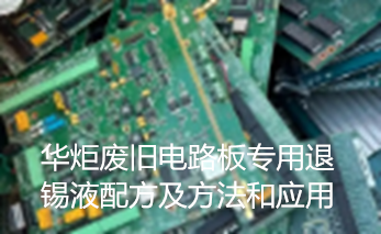 华炬新产品研究所技术咨询委员会科研人员现推荐一项一种废旧电路板专用退锡液配方及方法和应用,该技术提供的退锡液,具有以下有益效果:(1)具有强氧化性,对焊锡的溶解速度快;(2)原料简单易得,制备成本低廉;(3)不含稳定剂,脱焊后形成的废退锡液可静置生成β-锡酸沉淀,方便回收锡金属;(4)组分简单,有利于对废液中的有价金属进行回收,现将该一种废旧电路板专用退锡液配方及方法和应用及实施例介绍如下供研究交流参考:(611511 233718)