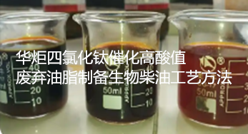 华炬新产品研究所技术咨询委员会科研人员现推荐一项一种四氯化钛催化高酸值废弃油脂制备生物柴油工艺方法,该技术与其它制备生物柴油的方法相比,具有以下优点:1、该技术采用路易斯酸催化剂在常压下同时催化游离脂肪酸的酯化反应和脂肪酸三甘油酯的酯交换反应,生产工艺简单,污染较小,反应过程中和后处理过程中基本没有皂化现象的发生,产品收率高、质量好。2、催化剂四氯化钛为液体,且溶于醇,反应过程中与油溶解性较好,对废弃油脂的催化效果好。催化剂四氯化钛是路易斯酸,腐蚀性较小。而且四氯化钛遇水立即水解产生沉淀,所以后处理时,通过加入水洗涤几乎可以除去所有的钛。所得的生物柴油产品基本不含金属离子钛。3、该技术原料来源广泛,生产工艺简单,反应条件温和,能耗低,产品收率高,后处理简单,而且反应过程及后处理中基本无皂化物生成。使工业化的实现更加可能,具有很高的工业价值。4、该技术中使用的过量的小分子醇可以在反应结束时纯化回收循环利用,分离出来的粗甘油通过精制可以得到工业级甘油用于其他的工业生产(如纺织、造纸、油漆等行业)。5、该技术解决了废弃油脂因没有得到充分、有效的利用而对环境造成的污染问题,避免了废弃油脂再次进入食用油市场危害人们的身体健康,为废弃油脂的回收再利用提供了一条新的途径,现将该一种四氯化钛催化高酸值废弃油脂制备生物柴油工艺方法及技术方案实施例介绍如下供研究交流参考:(371541 721653)