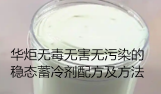 华炬新产品研究所技术咨询委员会科研人员现推荐一项一种无毒无害无污染的稳态蓄冷剂配方及方法,该技术具有的优点和积极效果是:该技术的稳态蓄冷剂中,由于采用的制备原料都为食品级原料,所得稳态蓄冷剂成品也为食品级,具有无毒、无害、无污染的优点,能够被广泛的应用于冷链物流、低温保鲜、智能冷站和临床医疗等领域,避免了蓄冷剂在储存和运输过程中对食物或药品造成的二次危害。当发生泄漏时,带有颜色的蓄冷剂还能够直接标示出泄漏源,便于更换蓄冷剂。本发明的稳态蓄冷剂的低温流动性能更好,在使用中始终处于非凝固态,因而可以采用强度较低的包材,从而降低了蓄冷剂的使用成本,现将该一种无毒无害无污染的稳态蓄冷剂配方及方法及技术方案实施例介绍如下供研究交流参考:(971421 325592)