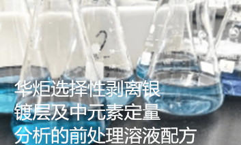 华炬新产品研究所技术咨询委员会科研人员现推荐一项选择性剥离银镀层及中元素定量分析的前处理溶液配方,该技术的技术效果是:不含有如硝酸、盐酸和硫酸等强酸,对镀银层进行剥离时,该溶液的使用能够极大地改善现场生产作业的环境;同时由于该溶液具有选择性腐蚀银的特性,所以该溶液对基材表面的影响小,并且可以直接作为银镀层中元素定量分析的前处理液,现将该选择性剥离银镀层及中元素定量分析的前处理溶液配方及技术方案实施例介绍如下供研究交流参考:(611441 351594)