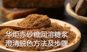 华炬新产品研究所技术咨询委员会科研人员现推荐一项一种赤砂糖回溶糖浆的澄清脱色方法及步骤,该技术赤砂糖回溶糖浆的澄清方法,具有以下优势: (1)在赤砂糖回溶糖浆中加入了多种絮凝剂,通过磷酸、糖化钙、凹凸棒土、瓜尔胶和聚丙烯酸钠的混合脱色体系对此高色值的物料进行处理,并结合上浮工艺,去除掉大部分的悬浮物、钙盐,提高了糖浆的纯度,降低了糖浆的色值、浊度和含硫量; (2)以凹凸棒土为脱色剂,凹凸棒土具有较好的长径比和丰富的内孔道,可以较好地吸附糖浆中的色素,且能加快糖浆澄清的时间周期,脱色效果显著; (3)在回溶糖浆中加入壳聚糖并结合沉降技术进行了二次脱色,进一步提高了脱色效果;(4)采用了上浮技术与沉降技术相结合的方法,大大优化了脱色和去杂效果,现将该一种赤砂糖回溶糖浆的澄清脱色方法及步骤及技术方案实施例介绍如下供研究交流参考:(371511 335498)