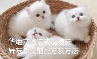 人、动物生存的环境久了,会存在异味、臭味。目前,市场上去异味除臭剂均采用化学洗法的方式,此种方式效果不够明显,且不廉价、不够环保,有可能存在二次污染。华炬新产品研究所技术咨询委员会科研人员现推荐一项一种宠物猫或动物去异味除臭剂配方及方法,该技术提供的一种宠物猫或动物用去异味除臭剂,工艺简便、杀菌率高、无二次污染、经济环保、使用寿命长等特点,现将该一种宠物猫或动物去异味除臭剂配方及方法及技术方案实施例介绍如下供研究交流参考:(311811 221655)