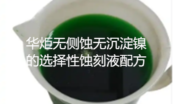 华炬新产品研究所技术咨询委员会科研人员现推荐一项一种无侧蚀无沉淀镍的选择性蚀刻液配方,该技术技术效果:该技术提供的蚀刻液可以选择性的对镍进行蚀刻,对铜几乎不腐蚀,选择性强,且经蚀刻后的铜板表面光亮,无沉淀,平整,无侧蚀,现将该一种无侧蚀无沉淀镍的选择性蚀刻液配方及技术方案实施例介绍如下供研究交流参考:(611511 224625)