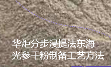 华炬新产品研究所技术咨询委员会科研人员现推荐一项一种分步浸提法东海光参干粉制备工艺方法,该技术与现有技术相比,该技术的优点在于: (1)采用超高压漂烫的方法,不仅可避免营养物质在蒸煮过程中流失,且可有效抑制自溶酶作用,避免自溶酶对营养成分的破坏; (2)分步浸提,使营养成分分步析出,避免反复蒸煮对营养成分的破坏; (3)采用生物酶水解浸提过滤中产生的残光参,最大程度地保留光参中光参肽、光参多糖、光参皂甙等多种营养成分;(4)真空冷冻干燥可进一步避免浸提液和酶解液中营养成分的破坏和流失。综上,该技术最大程度地保留了光参中的有效成分,有效避免了光参粉制备整个过程中营养物质的流失和活性物质的破坏,制备的光参粉色泽美观,无刺激性气味,可直接服用或进一步加工成片剂、胶囊等,现将该一种分步浸提法东海光参干粉制备工艺方法及技术方案及实施例介绍如下供研究交流参考:(341411 285438)